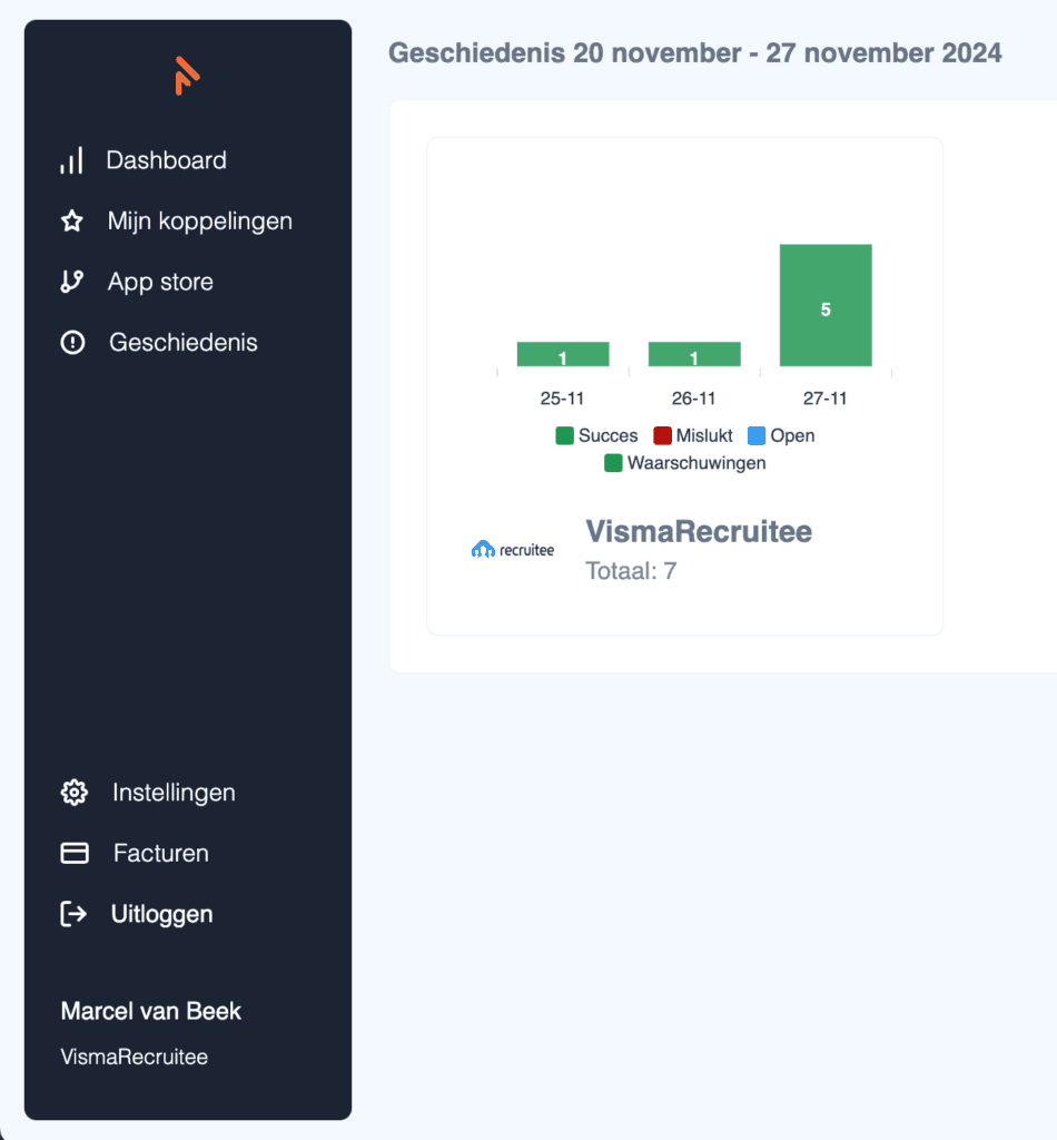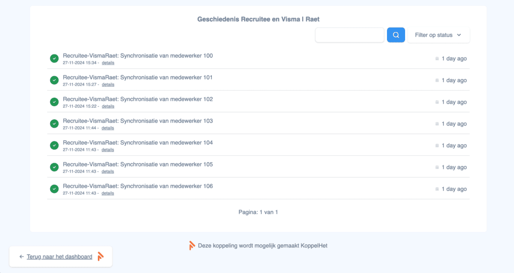 In het KoppelHet platform zie je terug welke synchronisaties in jouw koppelingen Recruitee en Visma Raet hebben plaatsgevonden. Dit is terug te zien op medewerker niveau, hierdoor ben je altijd op de hoogte van de data die wordt gesynchroniseerd en blijf je in control op jouw HR-koppelingen. Gaat er iets niet goed? Dan zie je in het platform terug met welke reden dit is en kun je de synchronisatie opnieuw draaien.