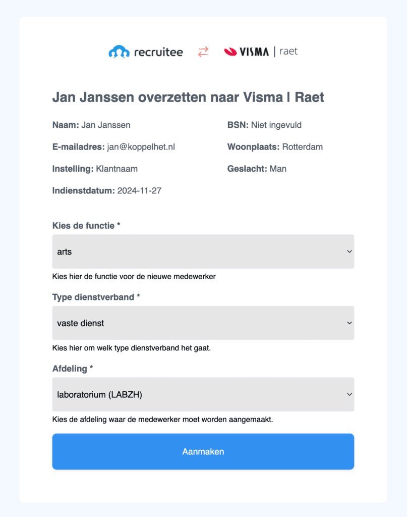 De koppeling haalt automatisch de functies, dienstverbanden en afdelingen op uit jullie Visma omgeving zodat de nieuwe medewerker automatisch op de juiste velden wordt gesynchronsieerd!
